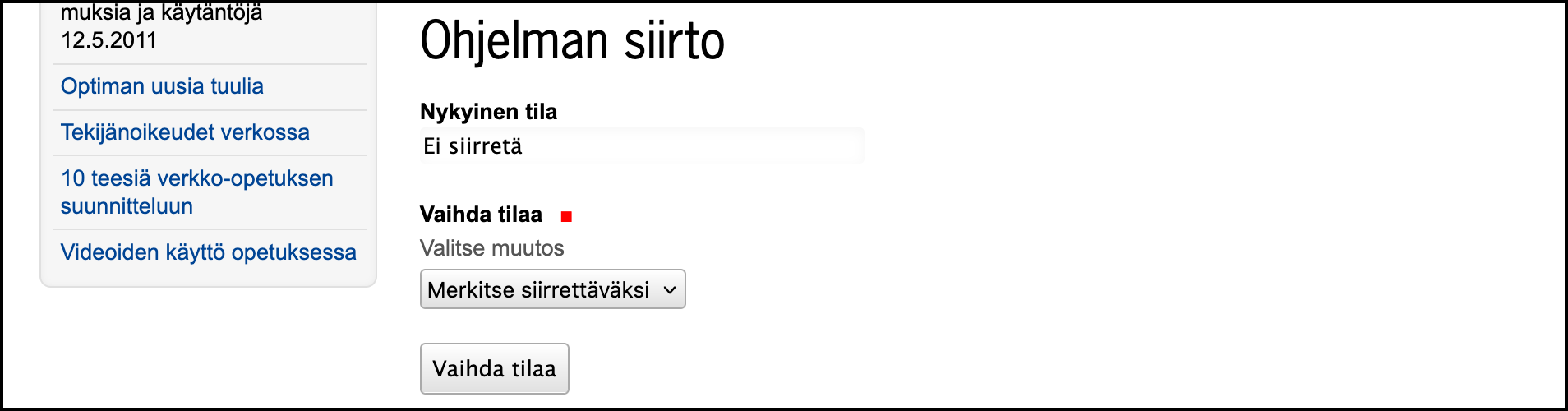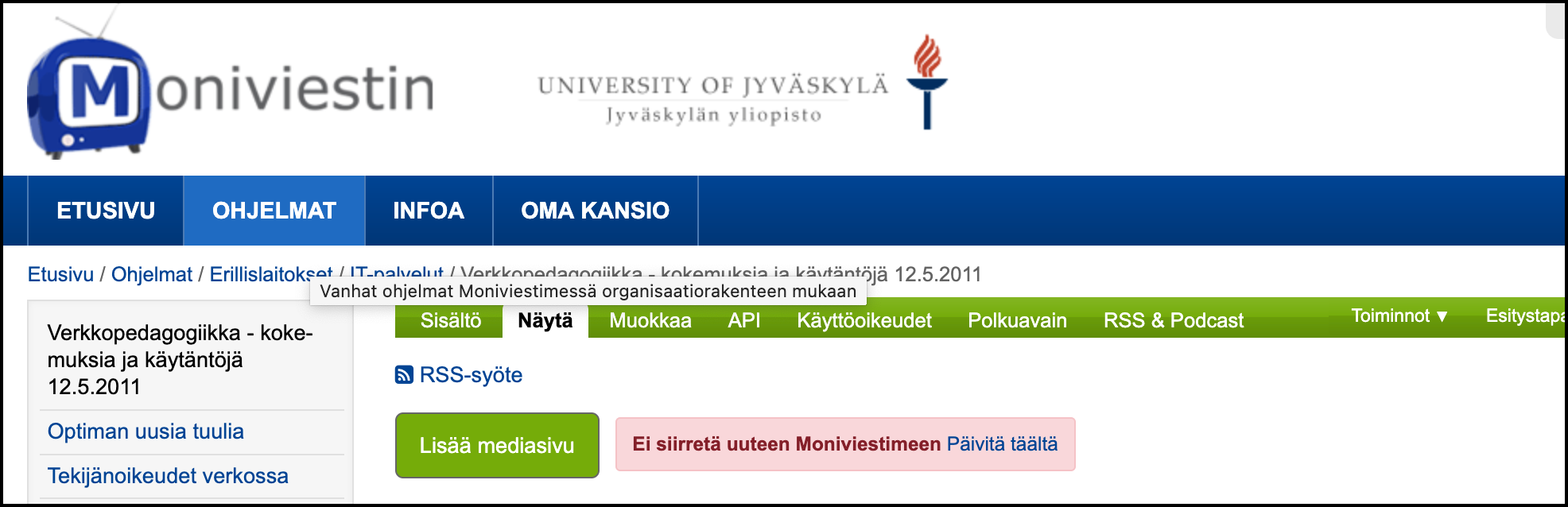 - Kirjaudu vanhaan Moniviestimeen https://m3.jyu.fi/jyumv/ ja navigoi oman ohjelmasi sivulle. Ohjelman sivulla näkyy punainen laatikko, jossa lukee oletuksena Ei siirretä uuteen Moniviestimeen